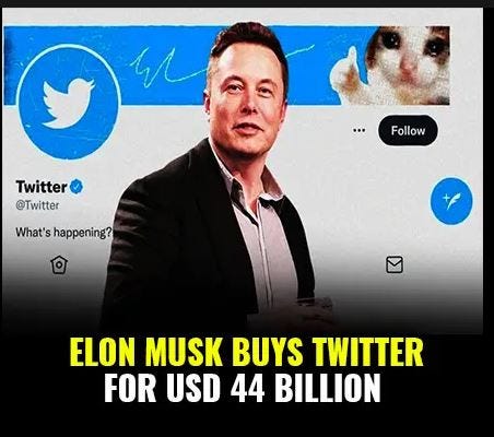 That’s where our hero Elon comes in. A massive 44 Billion with a B dollar bid to take over one of the world’s biggest platforms, with a plan to open up the channels of open public discourse and free speech once again.